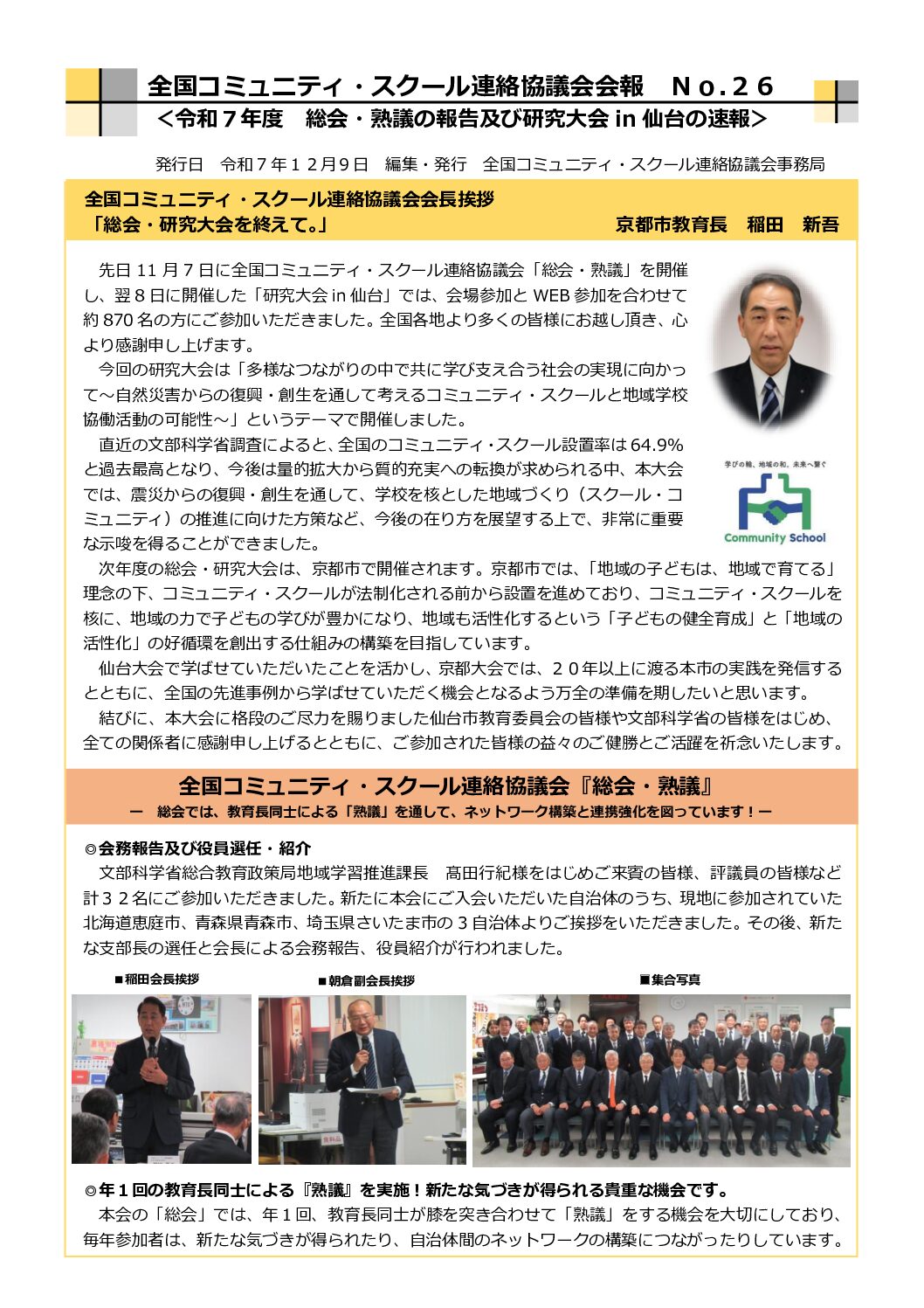 全国コミュニティ・スクール連絡協議会会長挨拶 会長 京都市教育長 稲田 新吾