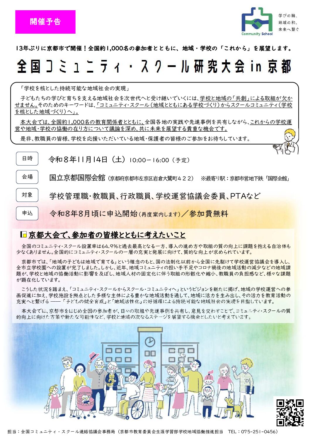 令和8年11月14日(土)に京都府京都市にて開催されます「全国コミュニティ・スクール研究大会 in 京都」の開催予告をお知らせいたします。詳細はこちらの案内チラシをご覧ください。